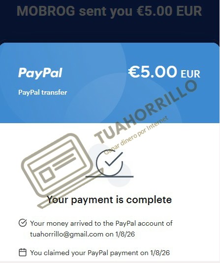 💰Paga por Paypal y el mínimo para solicitar el pago son 5€, en un plazo de 24h recibirás tu pago. Mobrog paga y aquí abajo tenéis la prueba en forma de comprobante de pago, es una pagina que puedes utilizar tranquilamente, es fiable y pagadora.